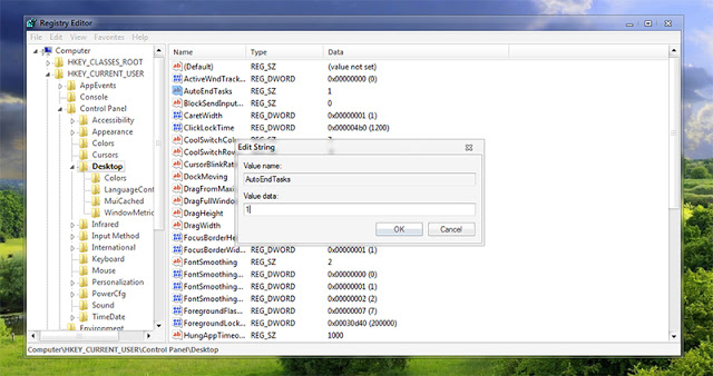 Bước 4: Click đúp chuột vào thẻ “AutoEndTasks” vừa tạo, sau đó thay đổi giá trị “Value data” từ 0 thành 1 và nhấp vào OK.